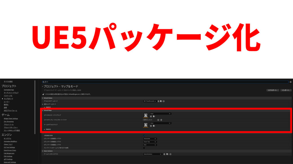 UE5.6でゲームをパッケージ化 ゲーム配信サイトGameHub 実際の作業フロー ①プロジェクト設定➡マップ設定 デフォルトマップとゲームスタート時のマップを指定します。 ②プロジェクト設定➡パッケージ化➡詳細設定➡マップのみクック➡パッケージ化されたビルド... -